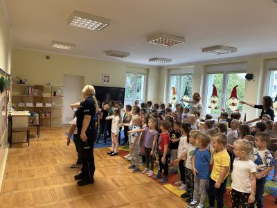 Pani policjantka w przystępny sposób przybliżyła przedszkolakom zasady bezpiecznego poruszania się po drogach, przypomniała numery alarmowe oraz wytłumaczyła, jak należy zachować się podcza