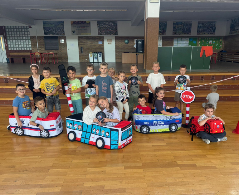 W piątek w ramach Europejskiego Tygodnia Mobilności nasza aula szkolna zamieniła się w prawdziwe miasteczko ruchu drogowego. Dzieci mogły wcielić się w rolę pieszych, rowerzystów i pasażerów, ucząc s