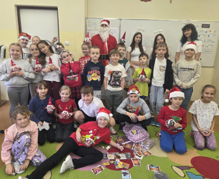 W naszej szkole pojawił się wyjątkowy gość — Święty Mikołaj, a towarzyszyły mu urocze aniołki–pomocnice. Mikołaj odwiedził uczniów i nauczycieli, zostawiając w klasa