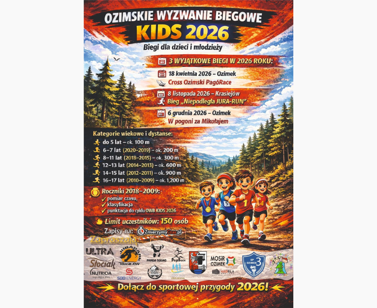 Z radością udostępniamy informację o Ozimskim Wyzwaniu Biegowym KIDS 2026 – cyklu biegów dla dzieci i młodzieży, który dostarczy mnóstwo sportowych emocji, radości z ruchu i zdrowej rywalizacji!